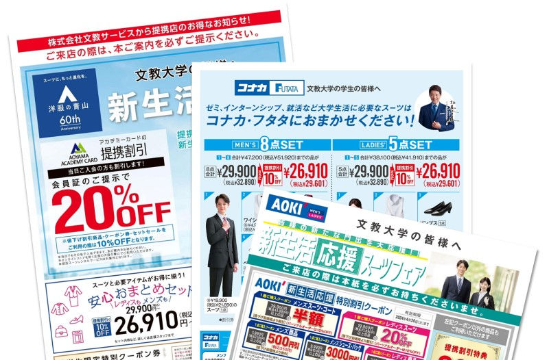 大学生になったら1セットは用意しておきたいスーツ。文教サービス提携店なら20%オフのスーツもご用意しています!